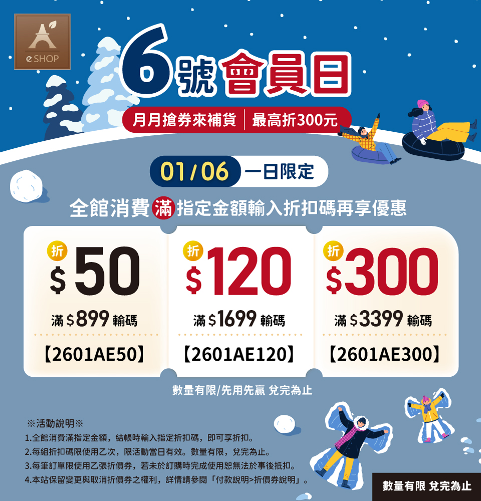 ● 每月6號全館消費滿指定金額,結帳時輸入指定折扣碼,即可享折扣。