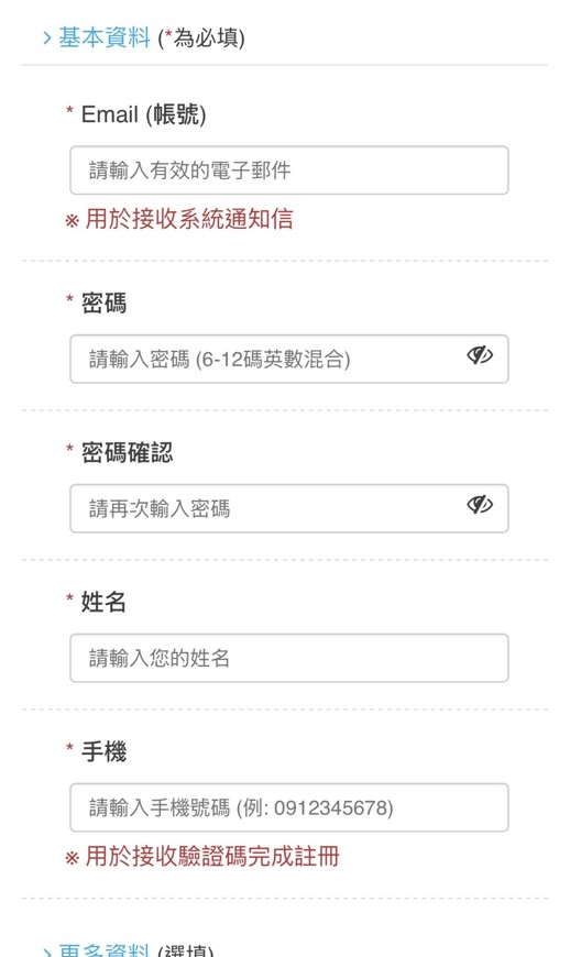 必填資料為:Email (帳號)、密碼、姓名、手機 (需完成手機驗證)。