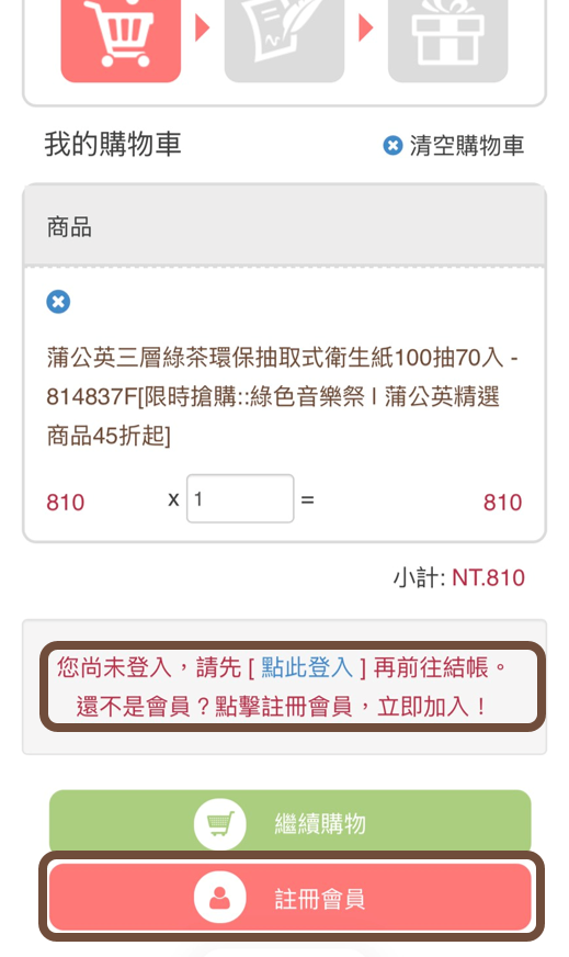 若登入或註冊時間過久,系統會重新整理,請重新將商品加入購物車。