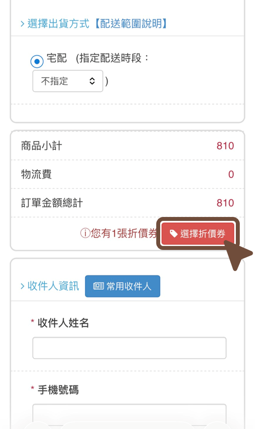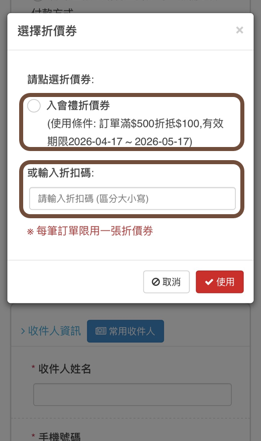 填寫訂單資料時,點選「選擇折價券」並輸入折價券上的折扣碼。