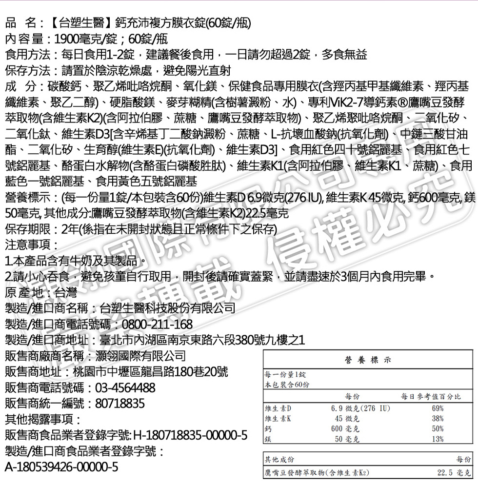 【台塑生醫】鈣充沛複方膜衣錠(60錠/瓶)