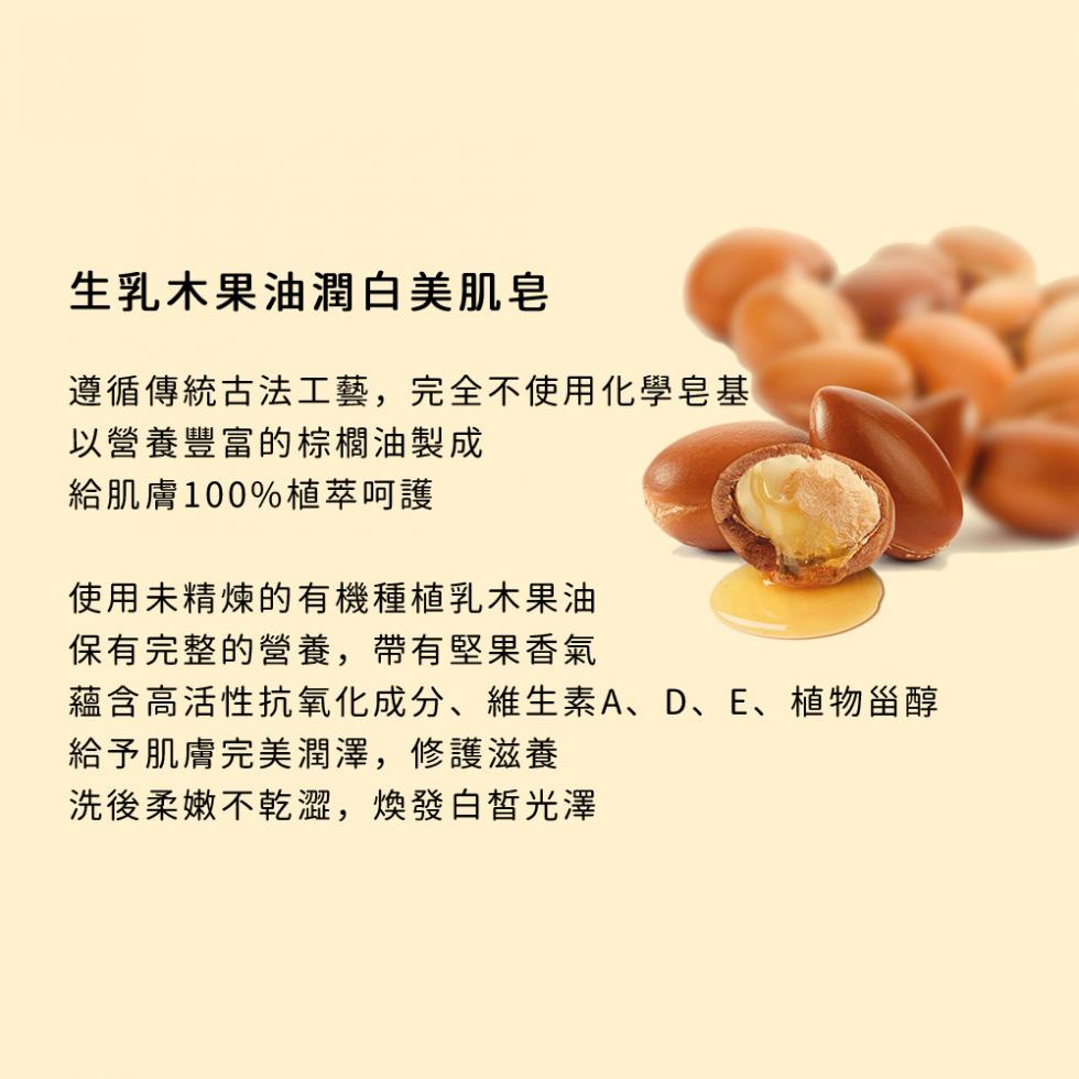① 添加有機原生乳木果油,蘊含高活性抗氧化成分、維生素A、D、E、植物甾醇,給予肌膚修護滋養,洗後柔嫩不乾澀,煥發白