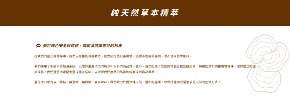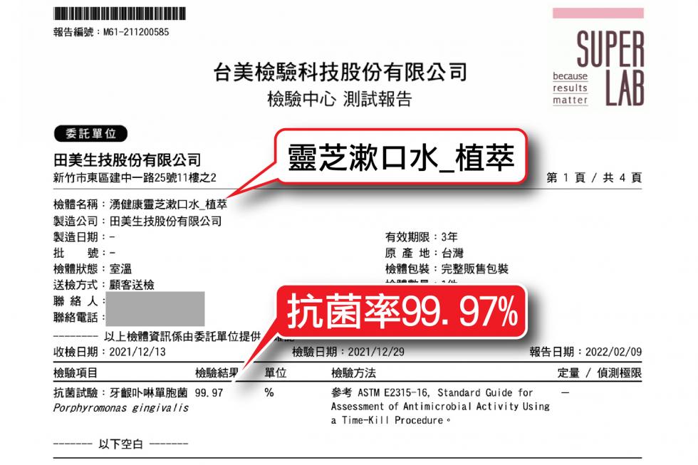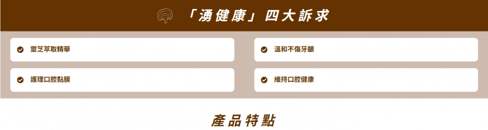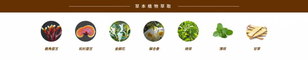 成分:純水、鹿角靈芝子實體萃取物、綠茶萃取物、蘇合香萃取物、木糖醇、山梨醇、甘油、金銀花萃取物、甘草萃取物、天然薄荷、松杉靈芝子實體粉、天然甜菊萃取物、酵母多糖、苯甲酸鈉、山梨酸鉀。