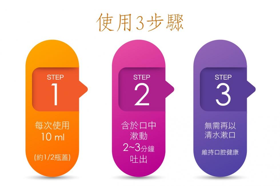 使用方式:每次使用10ml含於口中漱動2~3分鐘吐掉即可。