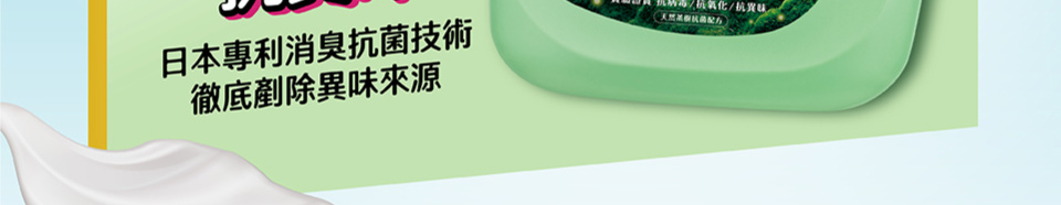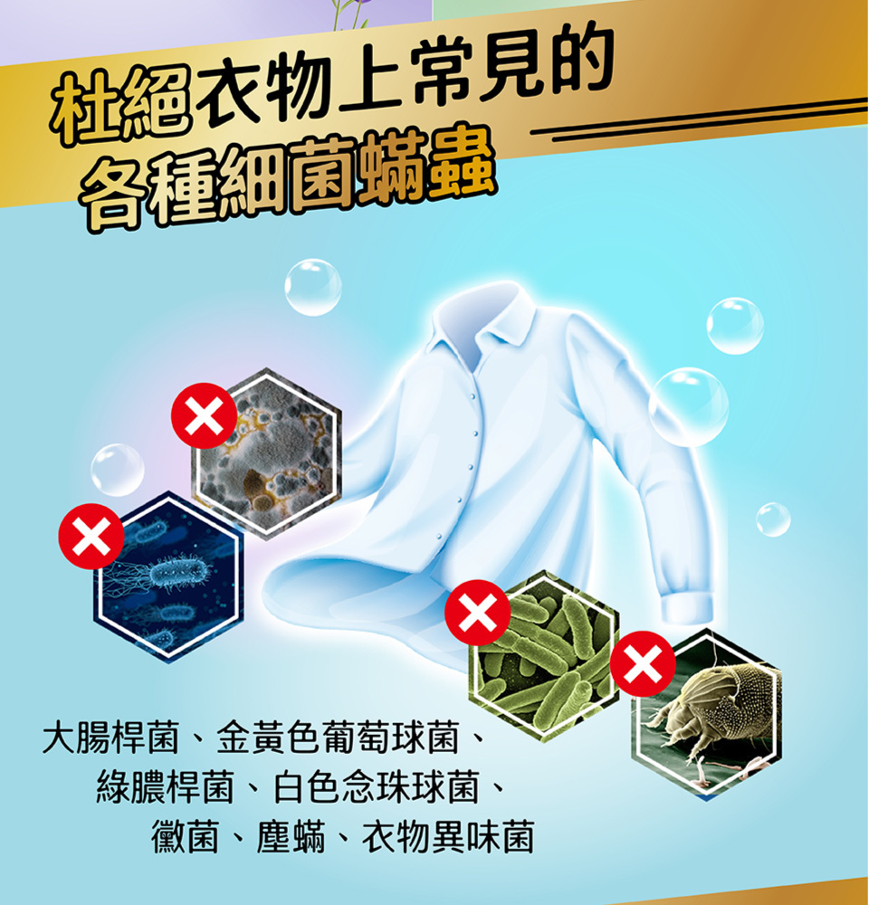 對抗外在環境!全方位守護衣物乾淨◆ 抗病毒:茶樹抗菌配方,經國內知名大學病毒實驗室測試,可有效對抗病毒(AB流感、腸病毒、冠狀病毒) (※冠狀病毒是指人類冠狀病毒229E) 經SGS驗證,有效洗淨衣物上常見之多種病菌(金黃色葡萄球菌、大腸桿菌、綠膿桿菌、白色念珠菌)◆ 抗氧化:AEO深層潔淨成分,徹底洗淨衣物上的皮脂汗漬,杜絕皮脂氧化造成衣物變黃◆ 抗異味:日本專利消臭及獨家抗菌技術,效果長達72小時,深入纖維底層徹底殺死細菌及剷除臭味。添加天然尤加利精油防螨配方,有效對抗塵螨,天然香蜂草萃取液,防止黴菌滋生、去除霉味。